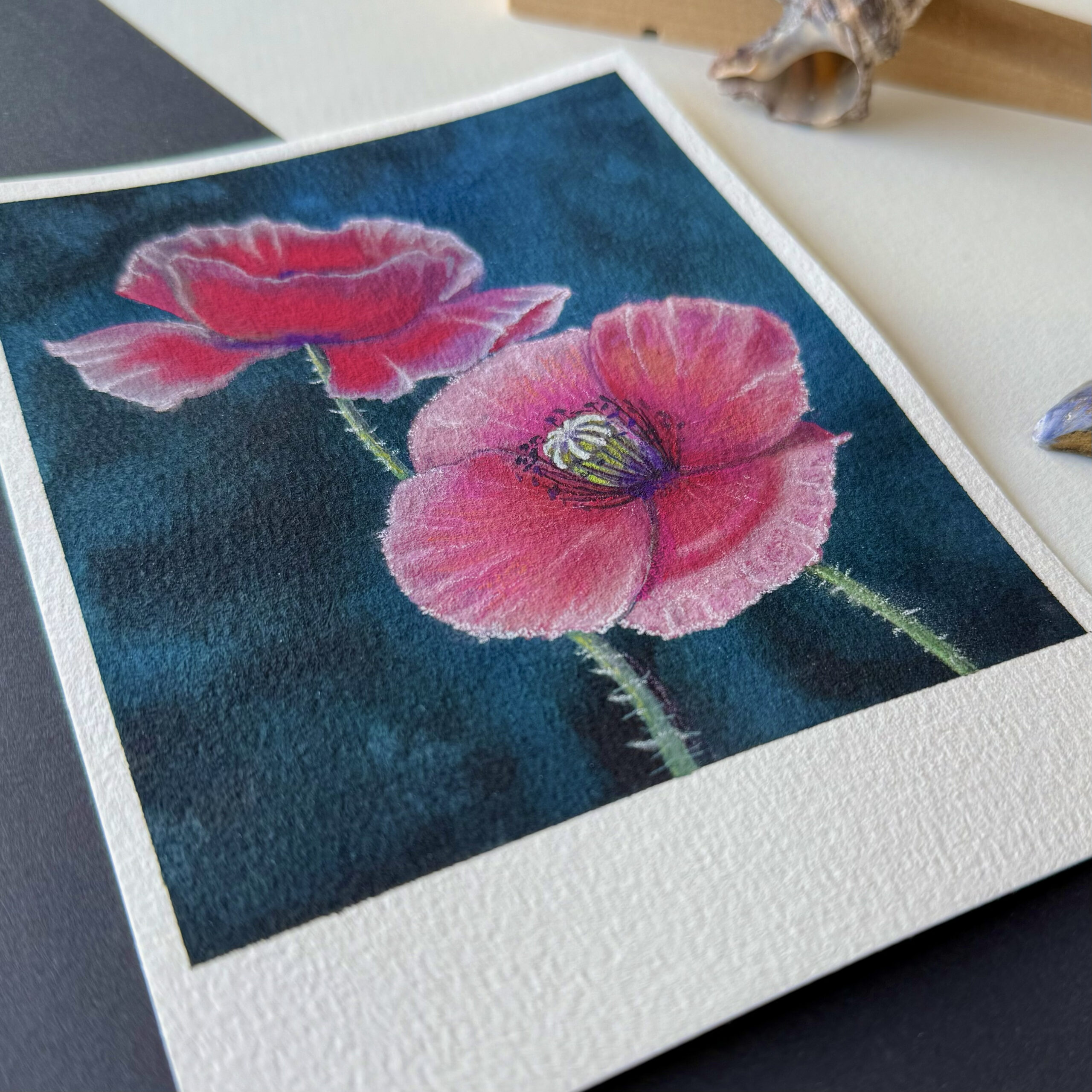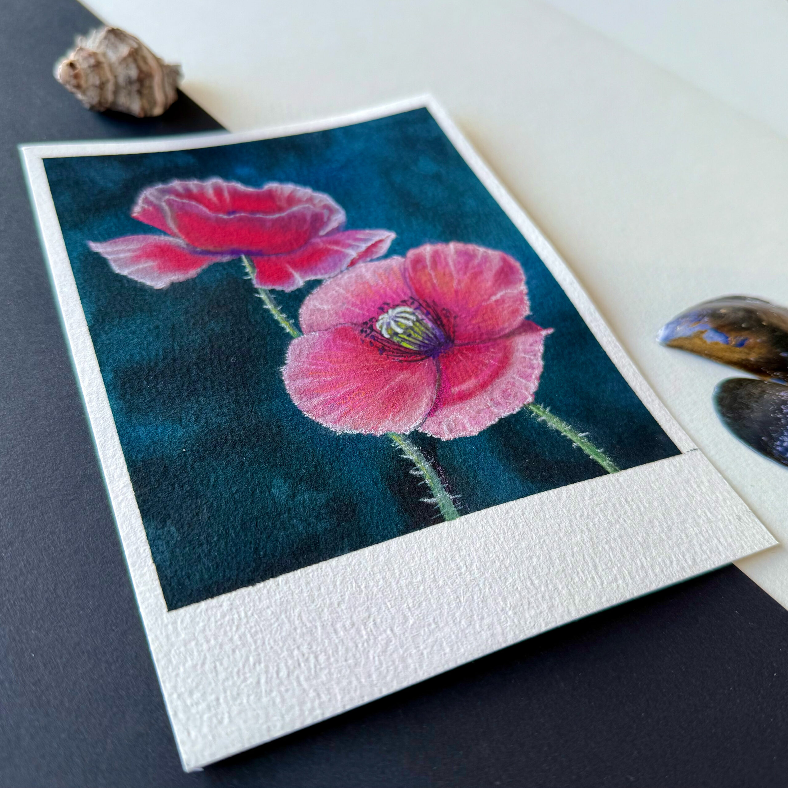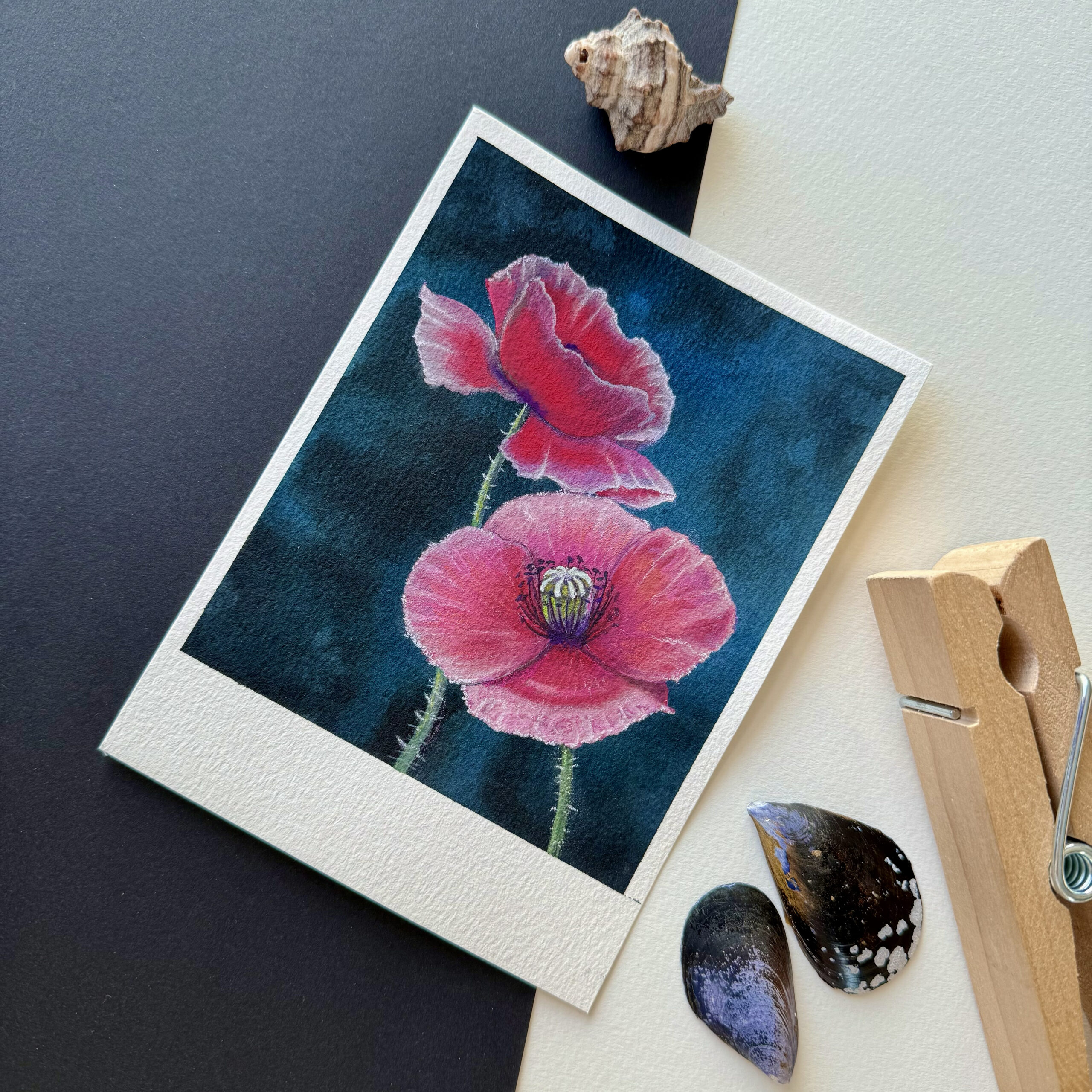 If you love these delicate beauties and don’t want them to wither, this is the way. I have immortalized them in the form of a polaroid-style watercolor painting. The wider white border at the bottom is intended to evoke a sense of a memory or an old photograph, so that we may never forget these precious and fragile impressions:)