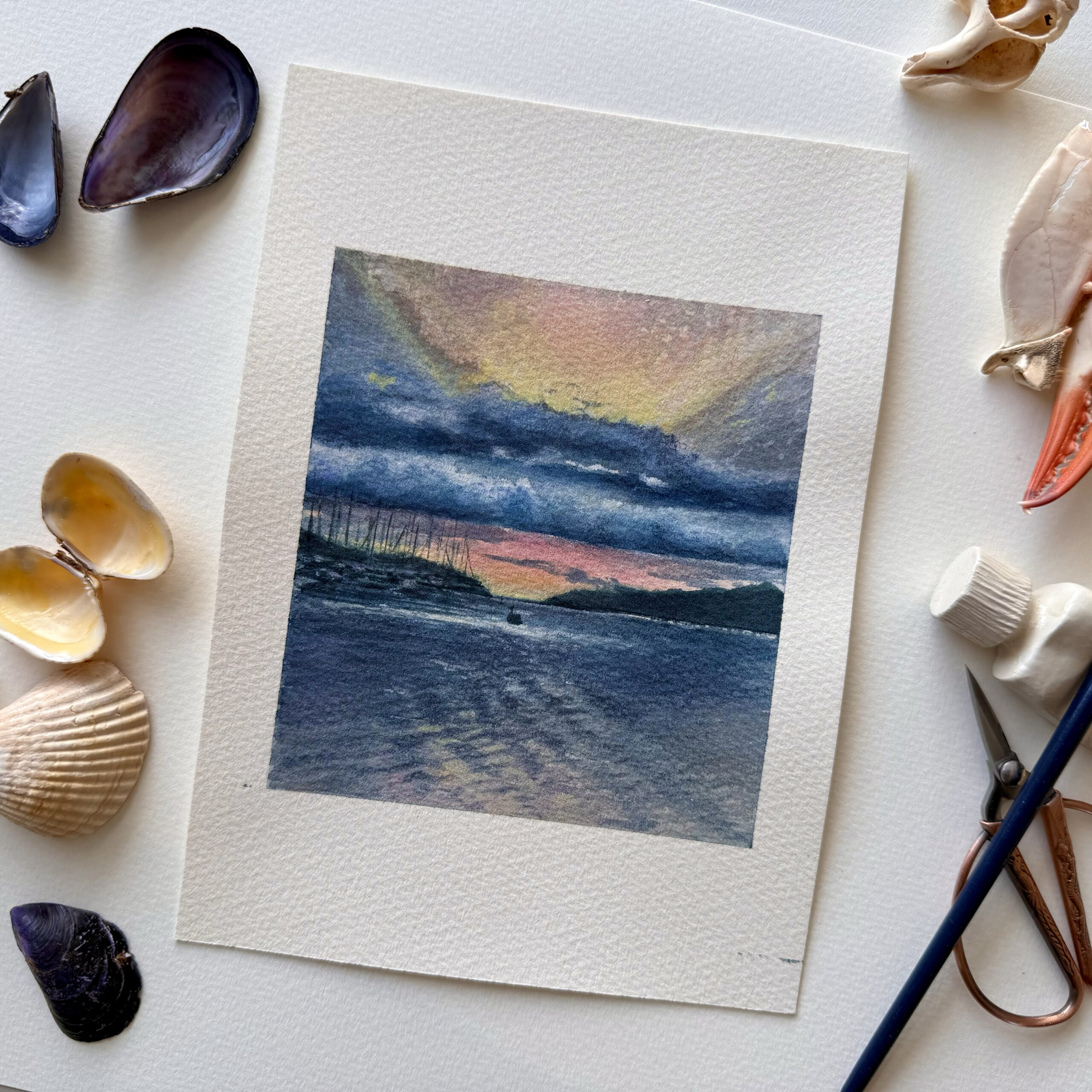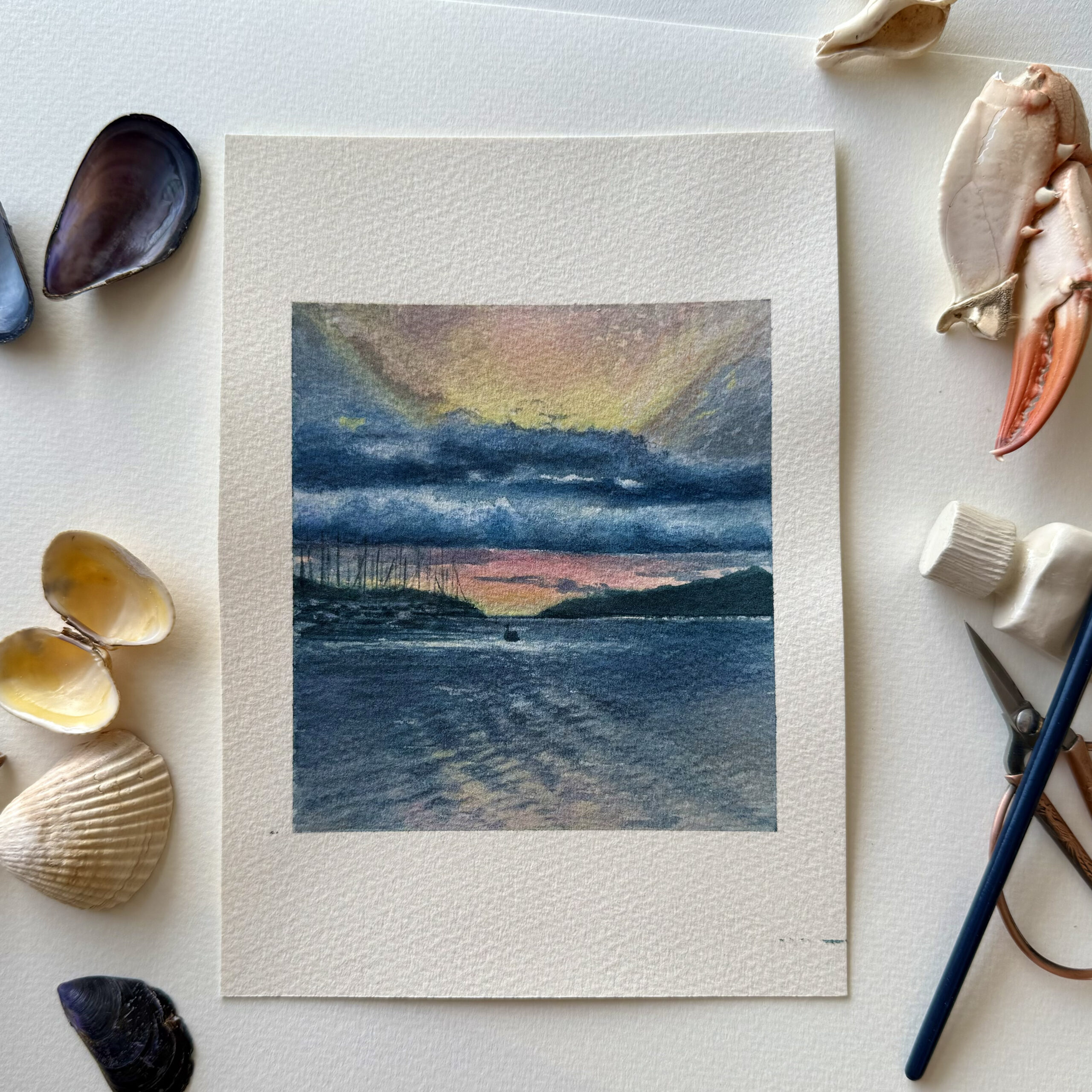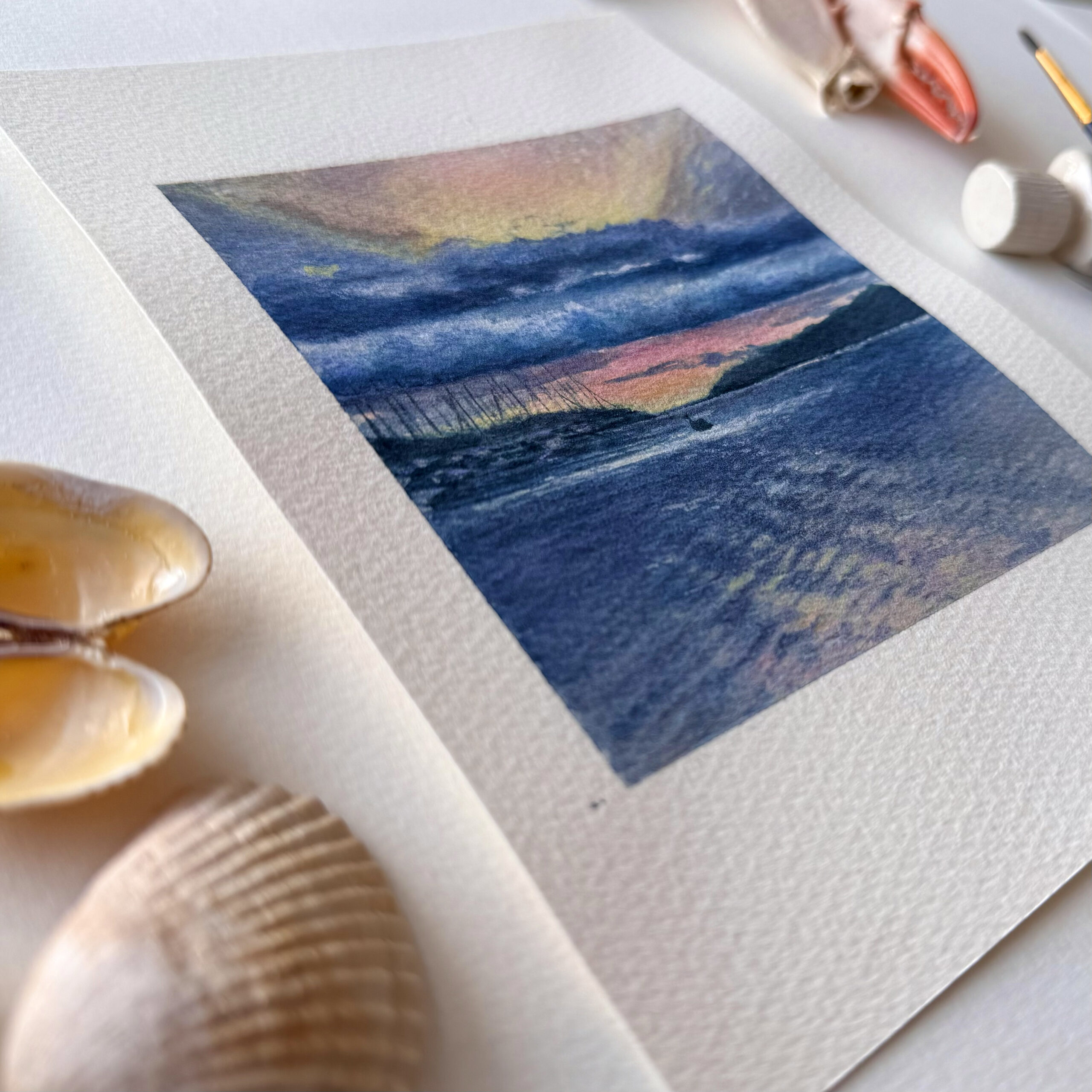 The original piece is a watercolor on 100% cotton Saunders Waterford paper. It was painted with Van Gogh watercolors, and the final layer was refined with Derwent pastel pencils. The painting has the character of a Polaroid shot, as I created a distinct white border (an asymmetrical one) at the top and bottom, allowing the image to resonate as a memory, a memory of what is yet to come.