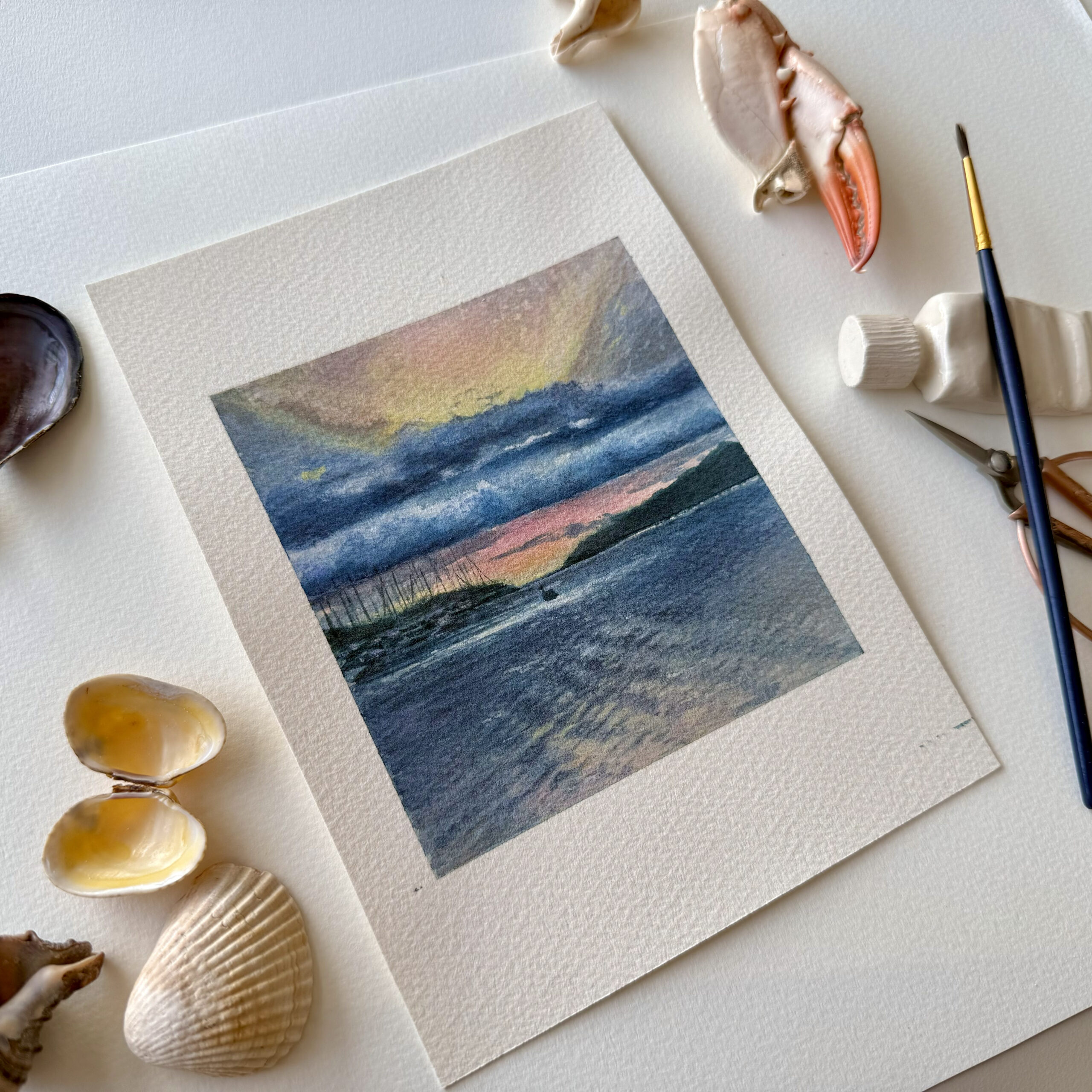 For all of you, landlocked and daydreaming a bit desperately of the sea and the salt on your sandals every single day, this painting is for you. It brings peace, embodied in the soft tones of the sweet, approaching summer. This is what waiting looks like. We can wait together:)