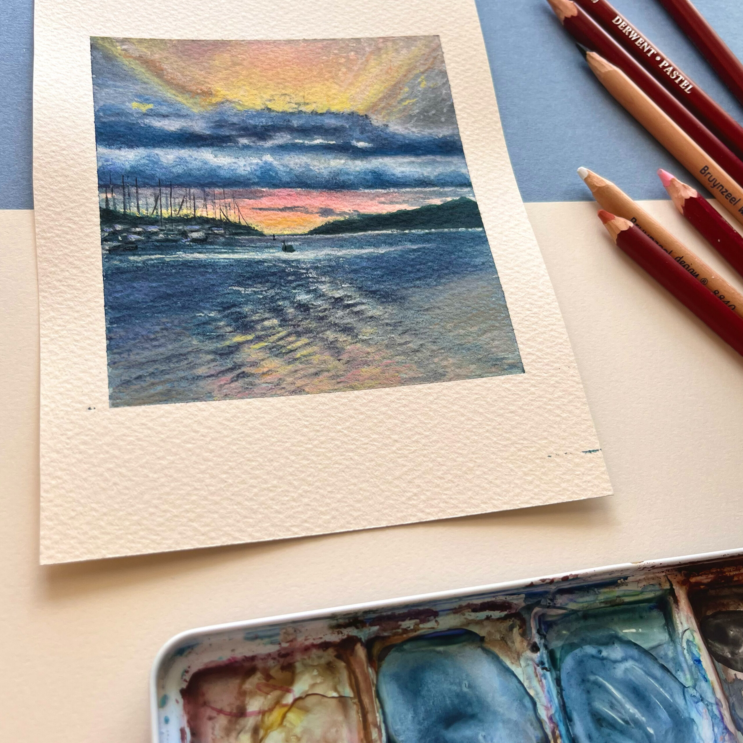 The experience was heightened by the clinking of ropes against the masts in the nearby Seget marina, which only intensified the „nautical“ atmosphere each evening. I watched this sunset from my window or balcony perhaps a hundred times, and it was undoubtedly one of the most beautiful places I have ever lived. Not everyone gets such an opportunity, I might never have it again myself, so it wasn’t a question of if I would paint it, but rather how many more times I will.